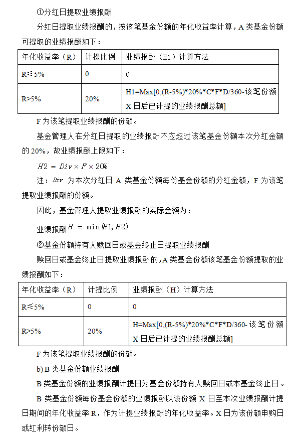 | 基金分红 | 1、在符合有关基金分红条件的前提下,本基金管理人可以根据实际情况进行收益分配,具体分配方案以公告为准; 2、本基金收益分配方式分两种:现金分红与红利再投资,投资者可选择现金红利或将现金红利自动转为对应基金份额进行再投资;若投资者不选择,本基金默认的收益分配方式是现金分红;每位基金份额持有人获得的分红收益金额或再投资份额保留小数点后两位,第三位四舍五入; 选择采取现金分配的,在该红利发放之日起7个工作日内,将现金红利扣除基金管理人应提业绩报酬后划转到基金份额持有人的基金交易账户;选择采取红利再投资方式的,分红资金扣除基金管理人应提业绩报酬后按分红除息日各类基金份额的单位净值转成相应的基金份额; 3、基金收益分配后基金份额净值不能低于面值,即基金收益分配基准日的基金份额净值减去每单位基金份额收益分配金额后不能低于面值; 4、同一类别的每一基金份额享有同等分配权; 5、法律法规或监管机关另有规定的,从其规定。 在对基金份额持有人利益无实质不利影响的前提下,基金管理人可对基金收益分配原则进行调整,不需召开基金份额持有人大会。 |