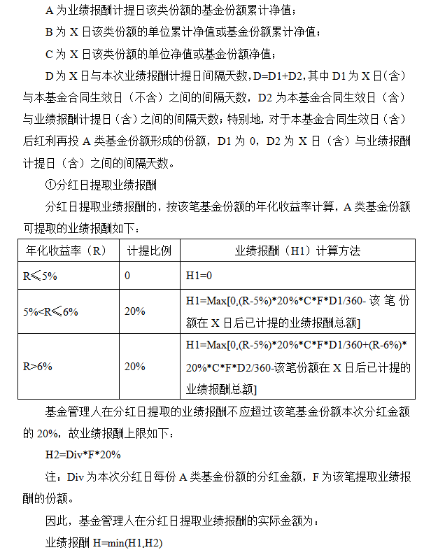 | 基金分红 | 1、在符合有关基金分红条件的前提下,本基金管理人可以根据实际情况进行收益分配,具体分配方案以公告为准; 本基金收益分配方式分两种:现金分红与红利再投资,投资者可选择现金分红或将现金分红自动转为对应基金份额进行再投资;若投资者不选择,本基金默认的收益分配方式是现金分红;每位基金份额持有人获得的分红收益金额或再投资份额保留小数点后两位,第三位四舍五入; 选择采取现金分红的,在该红利发放之日起7个工作日内,将现金分红扣除基金管理人应提业绩报酬(如有)后划转到基金份额持有人的基金交易账户;选择采取红利再投资方式的,分红资金扣除基金管理人应提业绩报酬(如有)后按分红除息日各类基金份额的基金份额净值转成相应的基金份额; 3、基金收益分配后基金份额净值不能低于面值,即基金收益分配基准日的基金份额净值减去每单位基金份额收益分配金额后不能低于面值; 4、同一类别的每一基金份额享有同等分配权; 5、法律法规或监管机关另有规定的,从其规定。 在对基金份额持有人利益无实质不利影响的前提下,基金管理人可对基金收益分配原则进行调整,不需召开基金份额持有人大会。 |