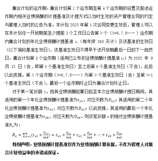 | 产品开放日 | 本集合计划成立后每自然周前两个工作日开放(当周只有一个工作日的,则当周只开放一个工作日;当周无工作日的,则当周不开放)。具体开放日期以管理人公告为准。 如果本集合计划合同变更时,管理人可公告临时开放期,委托人可在临时开放期退出集合计划。 业务办理时间为上海证券交易所、深圳证券交易所的正常交易日的交易时间。若出现新的证券交易市场或其他特殊情况,管理人将视情况对办理参与及/或退出的日期及时间进行相应的调整并公告。 |